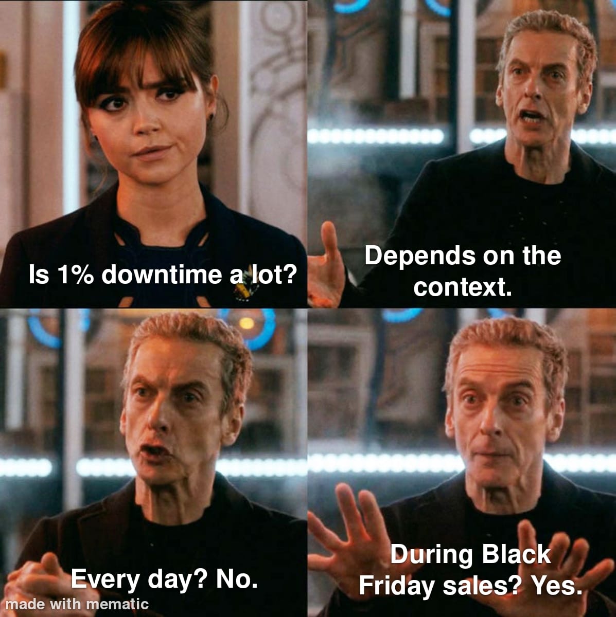 Imagine you are running an e-commerce website and you hosting provider guarantees you a 99% uptime. Is it good enough for your business? It depends. If the downtime occurs for 10 minutes every day when it's 3 am on your biggest market timezone, that's not too bad. Vice versa, if your site is not accessible for three days in a row starting from the Black Friday, well, you already know what you have to do.